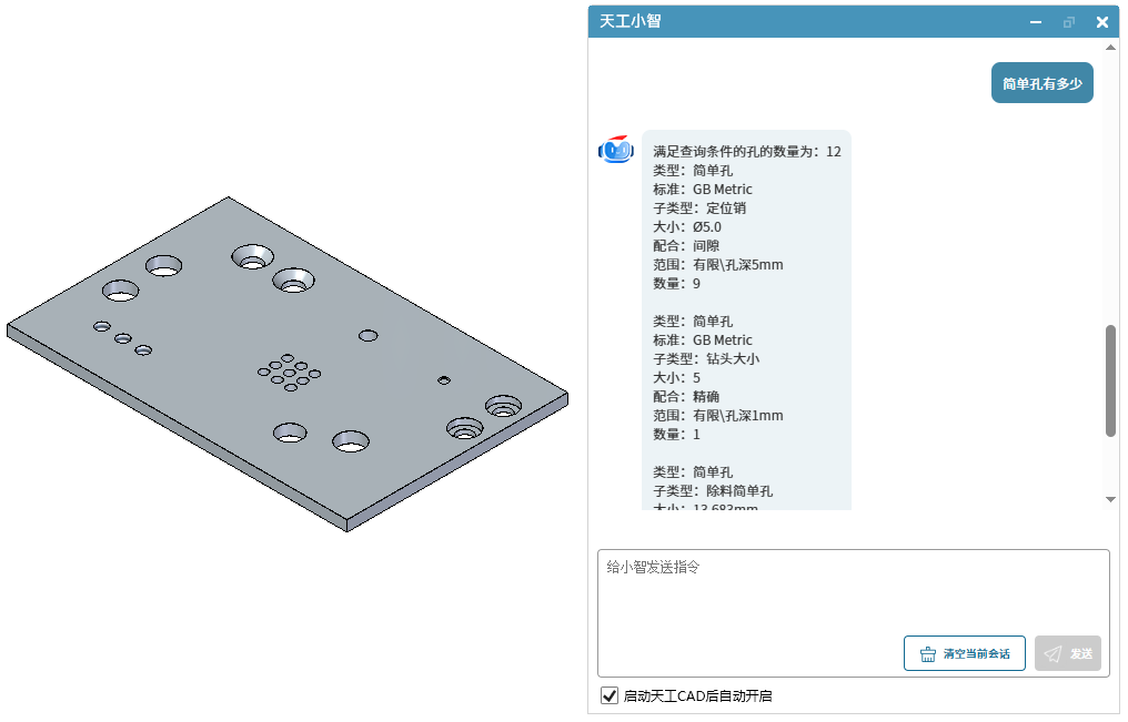 此功能适用于快速获取孔特征明细的场景。可以输出孔的类型、参数以及数量合计。