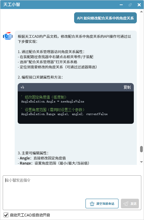 二次开发知识查询 功能说明 SDK 知识查询可帮助用户快速获取二次开发接口常用代码。 使用方法 在天工小智会话窗口,输入 API + 问题 并发送。小智会自动查询天工CAD 二次开发知识库并返回匹配结果。 场景示例 在设计建模的任何环节,都可以查询二次开发接口代码。以下是一些示例: API 如何创建矩形阵列 API 如何修改配合关系中的角度关系