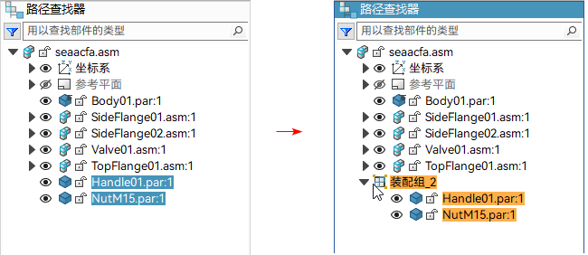 处理包含少数或不包含子装配的大型装配时,为部件分组也非常有用。可选择一组零件,使用路径查找器快捷菜单上的分组命令将它们定义为一组,然后使用重命名命令将该组重命名为一个更符合逻辑的名称。