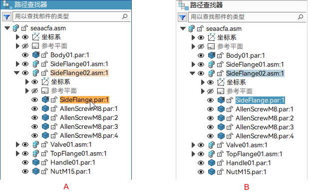图 A 以高亮颜色显示路径查找器,图 B 以所选颜色显示路径查找器,并以较浅的相应颜色显示父装配。