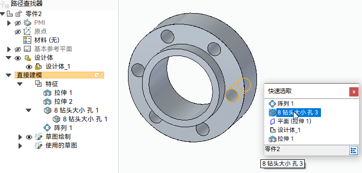 在直接建模模型中,孔、矩形阵列、圆形阵列和沿曲线进行阵列命令创建了特征集。
