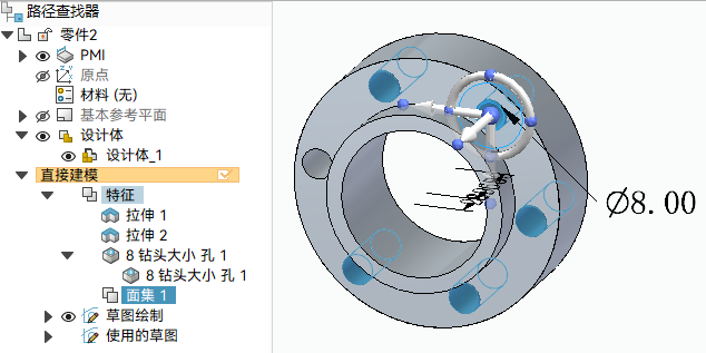 当您在一个特征操作中构造多个孔时,这些孔在路径查找器中作为集而显示,其中集的独立实例嵌套在集条目下。当您在路径查找器中高亮显示或选择特征集条目时,整个特征集都将处于高亮显示或选中状态。