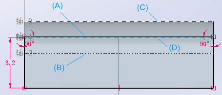 投影参考线(C)和(D)是附着边(厚度边)在当前轮廓平面的投影线,可作为外部尺寸和内部尺寸标注时的基准线。构造线(B)也是弯边平直的起点,也可作为尺寸标注时的基准线。
