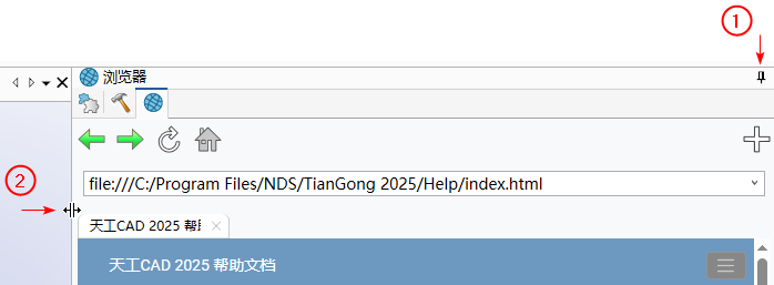 浏览器 在完成数据设计并将其检入Windchill 服务器后,可以登录 Windchill 网页端查看数据状态,并进行相关操作。浏览器窗格默认显示本地帮助文档主页面。 从应用程序右侧的侧边栏,展开浏览器窗格,如下图。 为方便在浏览器窗格操作,可关闭自动隐藏,如下图①,再将窗格宽度拉长,如下图②。 浏览器窗格中各个按钮的含义: :返回上一页 :前进到下一页 :刷新页面 :访问主页,主页是本地帮助文档主页面 :添加新的页签