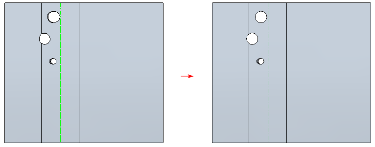 例如,下图中 3 个孔都与固定面正交,在展平图样中,此选项仅对孔 1 生效。孔 2 和孔 3 均不满足条件 1 。