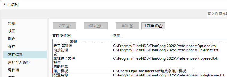 - 打开文件位置页(天工选项),将文档的保存位置添加到用户模板。