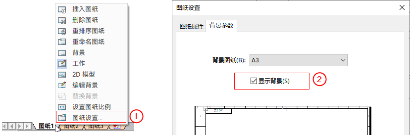 标题栏是背景图纸的一部分。在工作图纸中,可以通过显示/隐藏背景来实现标题栏的显示与隐藏。方法是:在图形窗口左下角的图纸页签上右键单击,选择图纸设置,在图纸设置对话框→背景参数页,勾选/取消勾选显示背景。