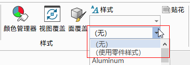 - 从路径查找器或图形窗口,选中要清除样式的元素,然后从功能区视图选项卡→样式组选择(无)或(使用零件样式)。