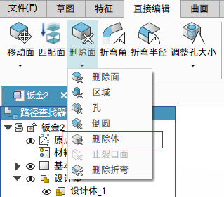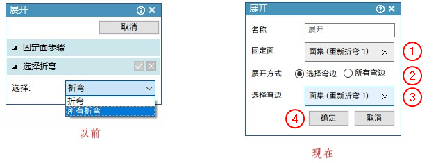 - 在单击新增的确定按钮前,用户可以随时修改固定面和弯边并预览展开效果,下图④。