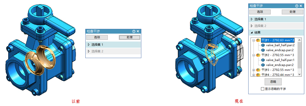 现在,使用检查干涉命令分析零件间干涉情况时,系统在结果呈现上进行了多项优化:
