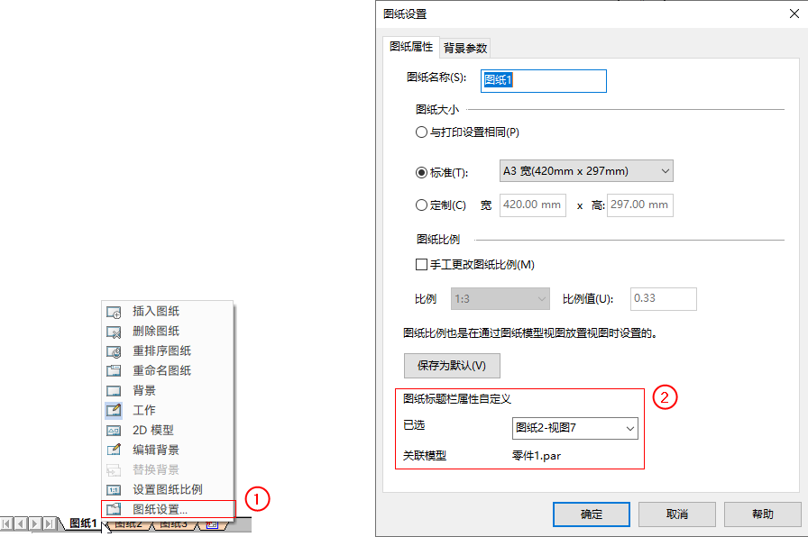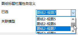 - 修改关联模型的方法:在图形窗口左下角的图纸页签上右键单击,选择图纸设置,在图纸设置对话框→图纸属性页,从已选下拉列表选择一个视图。标题栏将与该视图对应的模型建立关联。