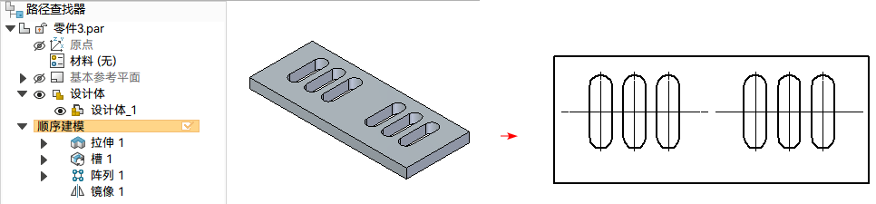 - 基于槽特征进行阵列操作生成的衍生对象;