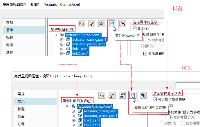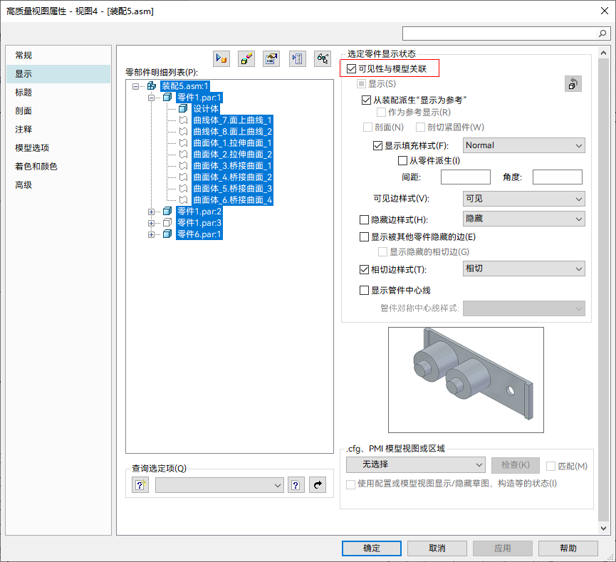- 显示选项卡(图纸视图属性对话框)增加了可见性与模型关联选项,勾选后,图纸视图中的设计体、构造体、零部件的显示/隐藏状态会与三维模型保持同步。此选项默认勾选。