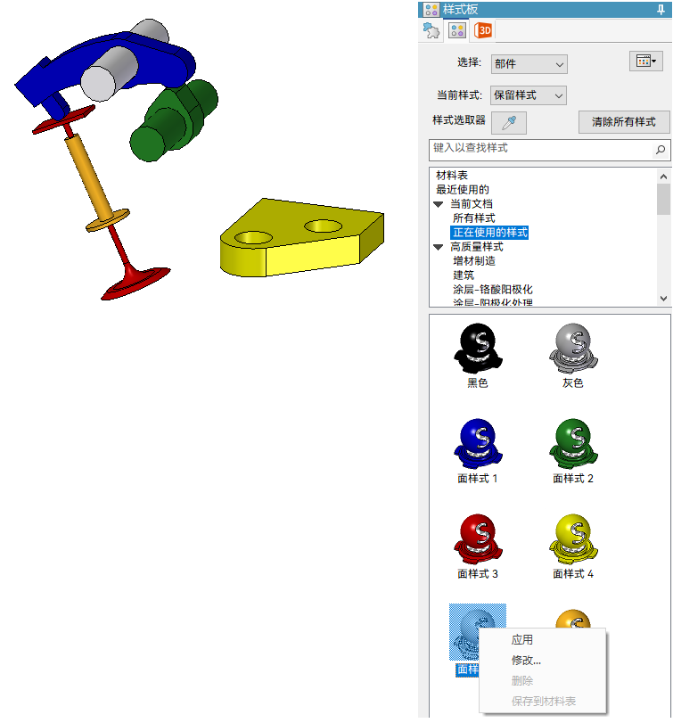 - 单击是,应用程序将为模型的每个面自动创建一个新的外观样式。新的外观样式会显示在样式板窗格的正在使用的样式清单中,方便用户修改和重用。