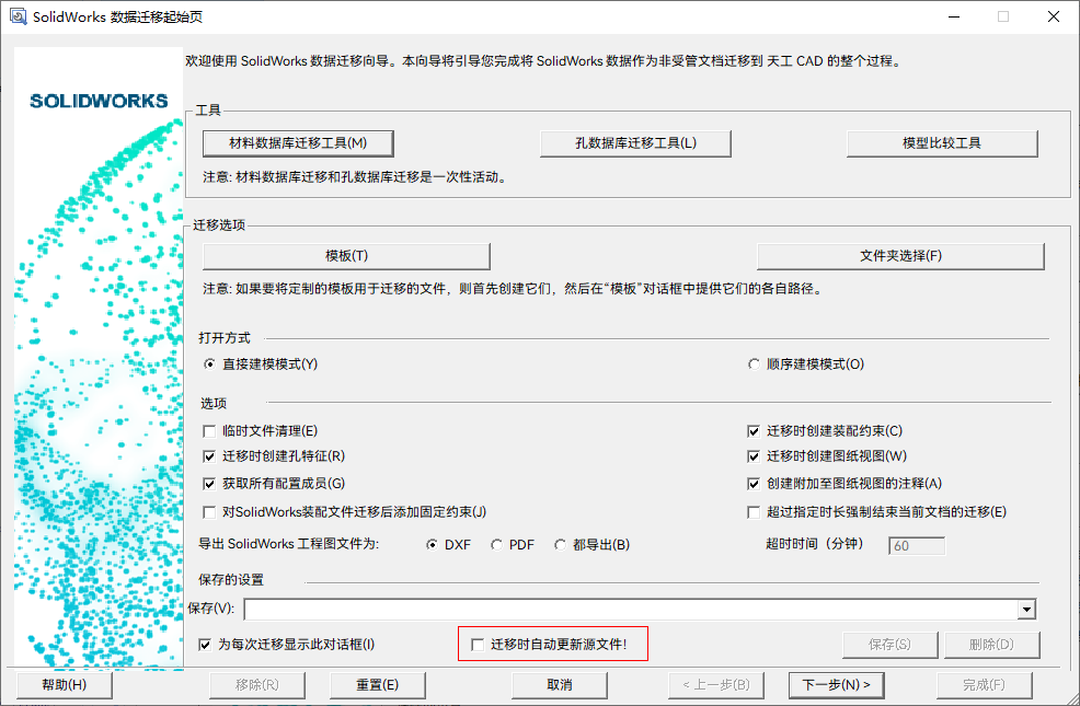 在SolidWorks数据迁移起始页增加了一个选项迁移时自动更新源文件! 。勾选时,迁移程序会在加载SolidWorks文档后先对其进行重建和保存,然后再执行迁移操作。对于版本比较旧的Solidworks文档,使用此选项可以提高迁移成功率。