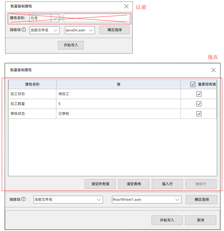 - 对话框增加记忆功能,打开批量复制属性对话框时,表格中会显示上一次添加的属性和值。
