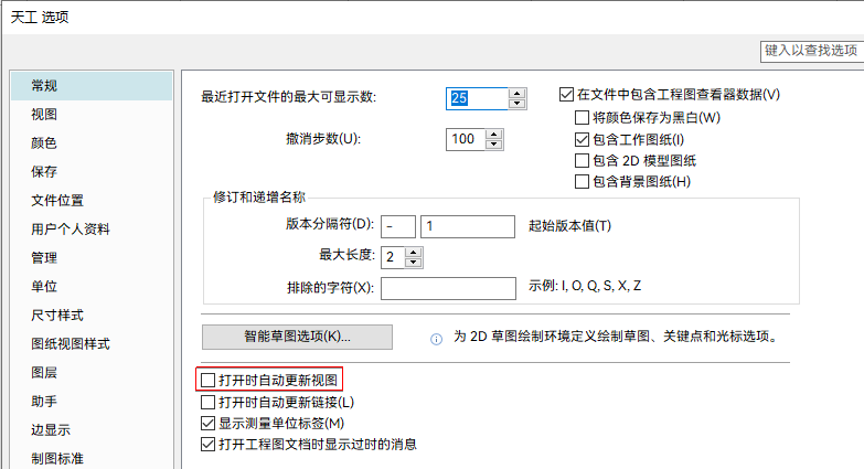现在,使用批量转换格式和批量打印处理天工CAD工程图文档时,系统会在转换/打印前自动更新图纸中的信息(例如,过时的零件明细表、投影信息、尺寸标注及投影视图),且这一自动更新机制不受常规页(天工选项/工程图环境)中打开时自动更新视图选项的影响。