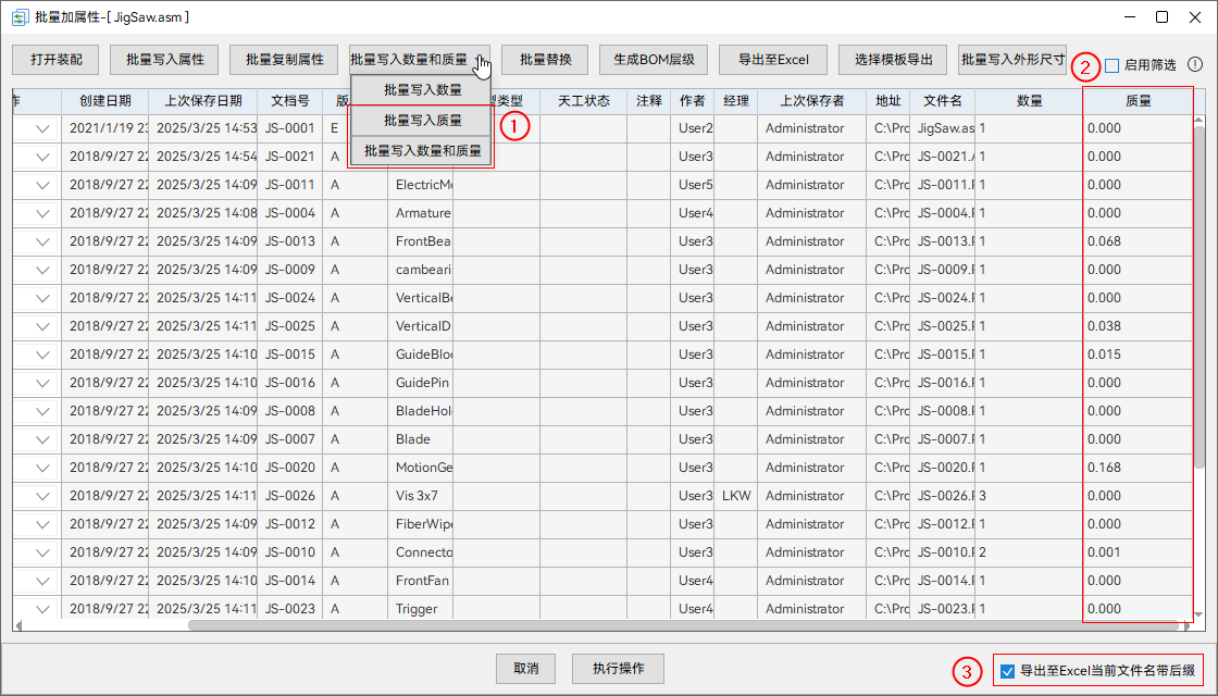 - 增加了批量写入质量功能,如下图①和②。质量来自零部件的物理属性。