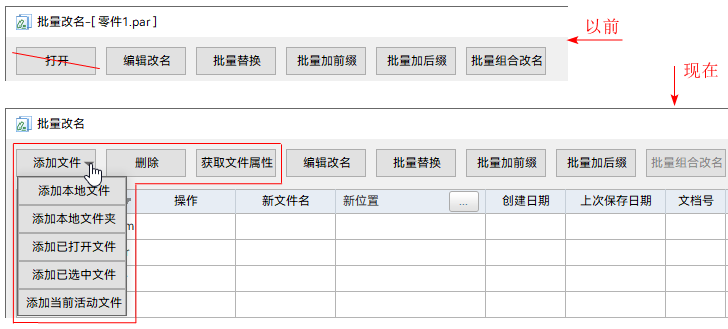 种添加文件的方式、新增删除按钮、新增获取文件属性按钮。