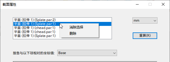 - 在功能区,选择测量与检查选项卡→3D测量组→截面属性命令,弹出截面属性对话框。